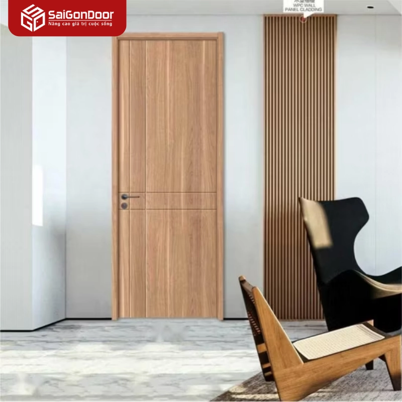Độ dày tiêu chuẩn của cánh cửa nhựa Hàn Quốc thường là 39mm, kết hợp cấu trúc 5 lớp đặc biệt (hai lớp ngoài là DeCo-Sheet nhựa thông hợp tính, hai lớp trong là ABS Sheet, lớp giữa là gỗ PVC, Honeycomb), tạo nên một khối vững chắc có khả năng cản âm hiệu quả. Bề mặt vật liệu của cửa nhựa ABS Hàn Quốc không chỉ mang lại tính thẩm mỹ cao với lớp vân gỗ tự nhiên mà còn có khả năng hấp thụ hoặc phản xạ âm thanh một cách tối ưu, góp phần giảm thiểu tiếng ồn vọng lại trong không gian, tạo cảm giác dễ chịu.